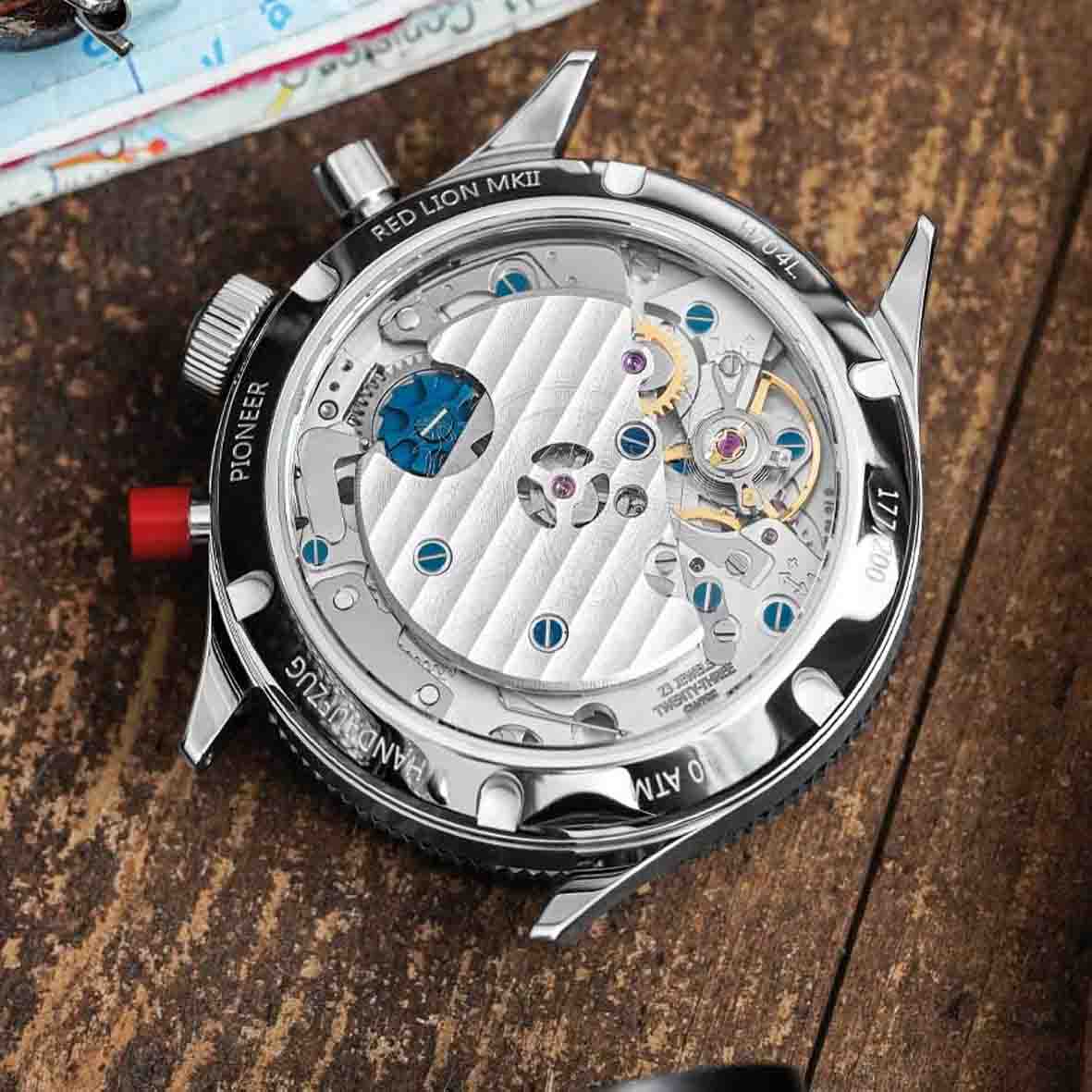 Animée par un mouvement mécanique à remontage manuel AMT5100 M de la manufacture Sellita, la Red Lion MK II bénéficie d'une fonction flyback et d'une réserve de marche de 58 heures, gages de performance et de fiabilité. Son verre saphir bombé avec traitement antireflet garantit une clarté optique supérieure, et son étanchéité à 100 mètres (10 ATM) la rend idéale pour un usage quotidien comme pour des aventures plus exigeantes.