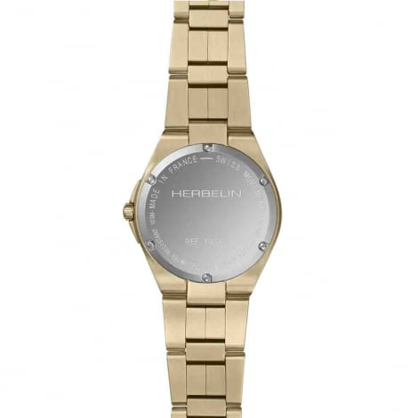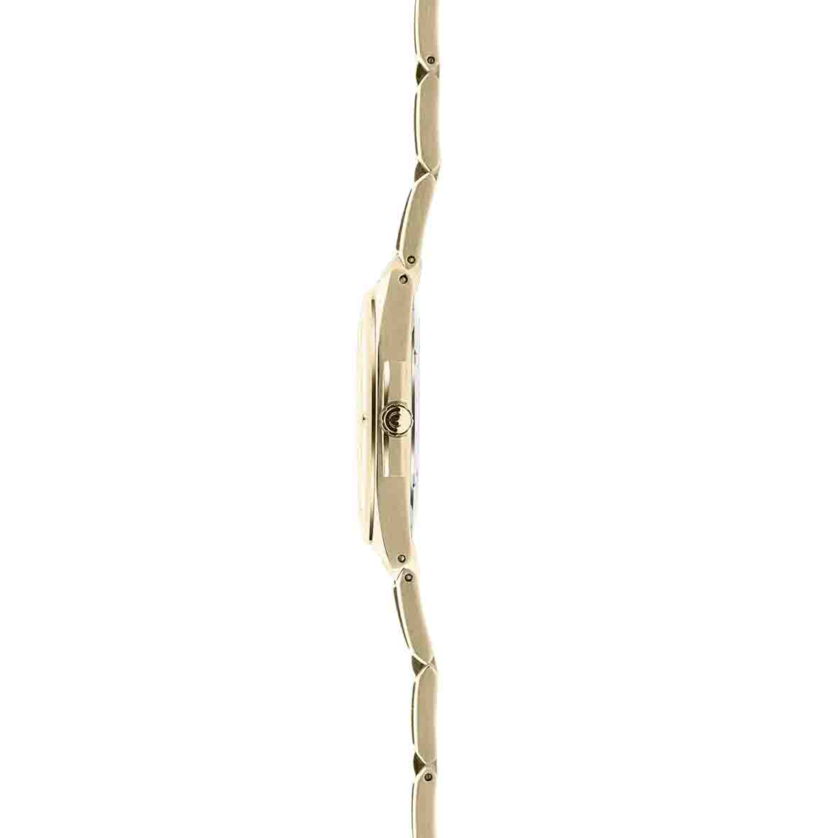La lunette, également en PVD Or Jaune, est ornée de six vis décoratives qui apportent une touche de modernité et de finesse.