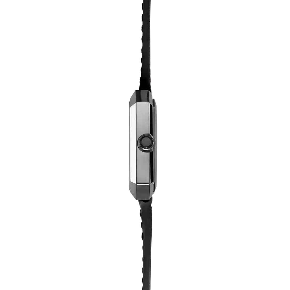 Le bracelet en cuir noir brillant, doté d’une boucle ardillon traditionnelle, complète ce modèle en lui ajoutant une touche chic et intemporelle.