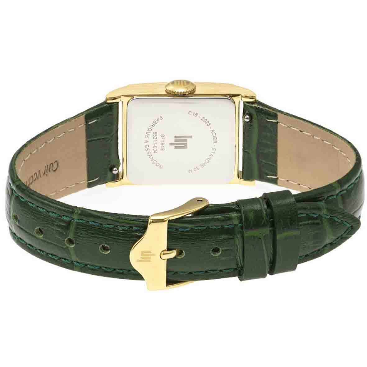 Le bracelet vert façon crocodile en cuir de vachette, superbement surpiqué en ton sur ton, confère à cette montre une élégance chaleureuse et accessible. Fermé par une boucle ardillon dorée, il épouse parfaitement le poignet avec ses 22 mm d'entre-cornes. Avec son mouvement quartz Miyota 1L40 et sa précision de ±20 secondes par mois, vous bénéficiez d'une fiabilité sans compromis.