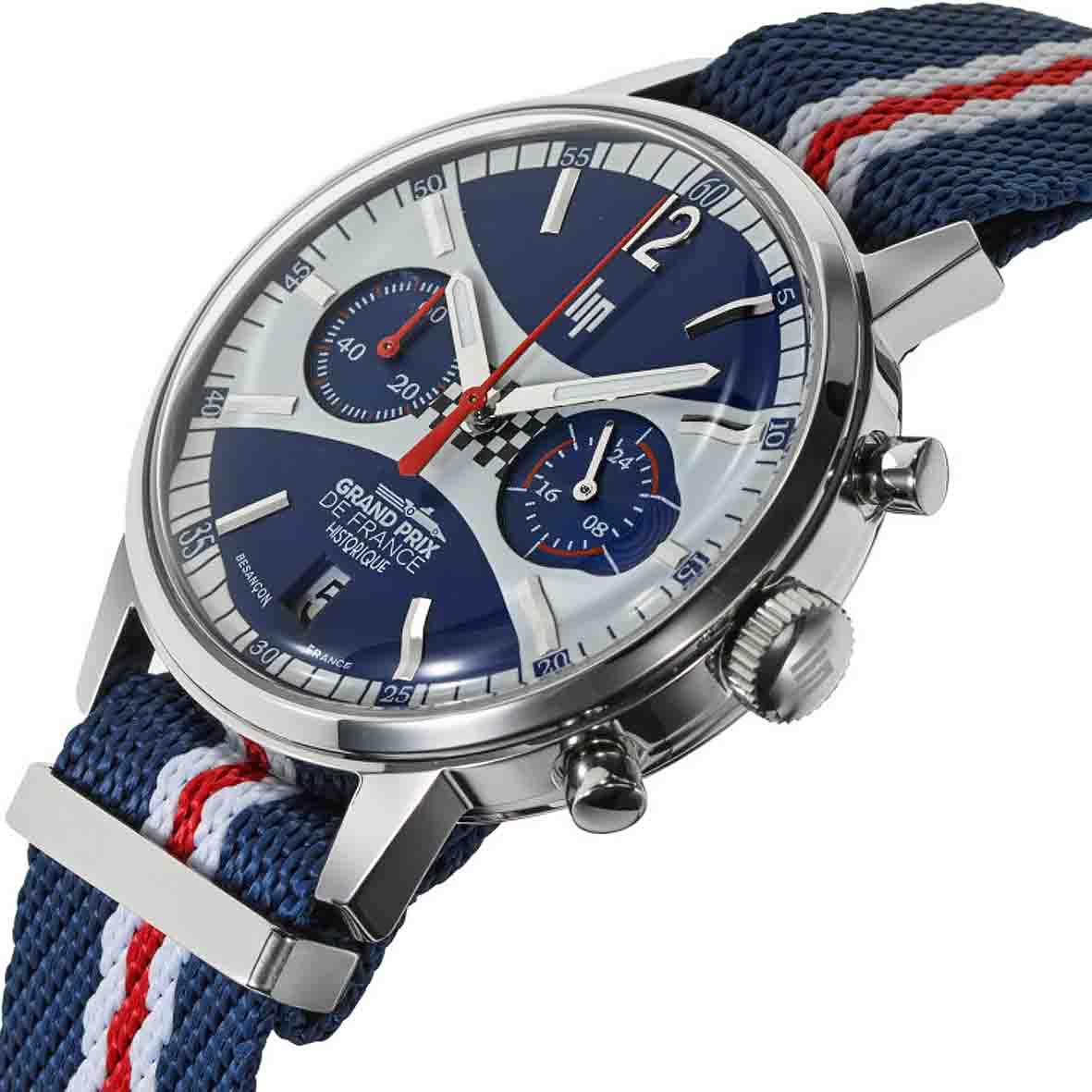 Cette montre chronographe est entièrement fabriquée en France à Besançon par la prestigieuse manufacture Lip, garantissant un savoir-faire horloger d'exception et une qualité française reconnue mondialement.