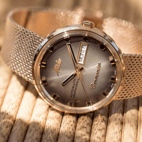 Le bracelet intégré et le logo MIDO vintage sont caractéristiques de ce modèle iconique ainsi que le boîtier monocoque qui renferme un mouvement automatique.