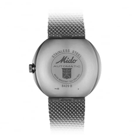 Le bracelet intégré et le logo MIDO vintage sont caractéristiques de ce modèle iconique ainsi que le boîtier monocoque qui renferme un mouvement automatique.