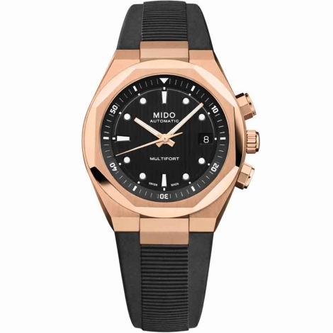 Découvrez la Montre Mido Multifort 8 Two Crowns, un garde-temps masculin qui réinvente les codes de l'horlogerie classique avec une audace et une fonctionnalité rares. Conçue pour l'homme moderne en quête d'excellence, cette montre Mido de la collection emblématique Multifort se distingue par son esthétique saisissante et ses innovations techniques. Son boîtier distinctif, aux lignes géométriques mesurant 38.4 x 40 mm, est magnifiquement travaillé en acier inoxydable avec un traitement PVD or rose, offrant une alliance parfaite entre robustesse et raffinement. La lunette octogonale vient souligner un cadran noir sophistiqué, gravé d'un relief horizontal qui capte la lumière avec élégance, tandis que les index et aiguilles bénéficient d'un revêtement Super-LumiNova® pour une lisibilité impeccable, même dans l'obscurité.