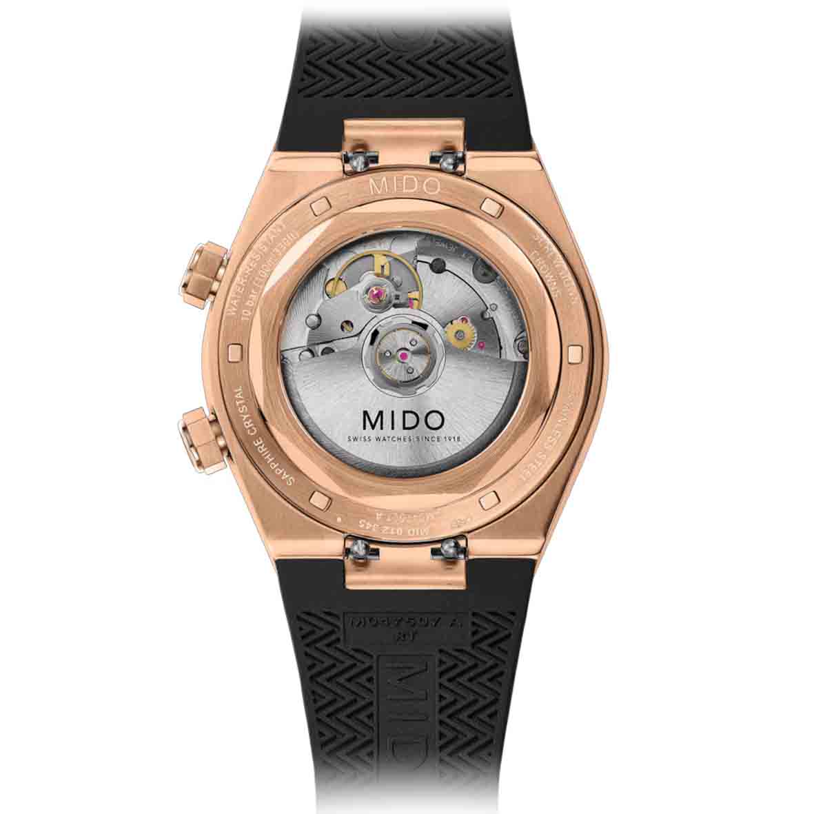Le boîtier de cette montre est conçu en acier inoxydable robuste, sublimé par un traitement PVD couleur or rose qui lui confère une résistance accrue à la corrosion et un éclat raffiné. Pour le verre, MIDO a opté pour un saphir inrayable avec un traitement anti-reflet double face, assurant une lisibilité optimale et une durabilité exceptionnelle.