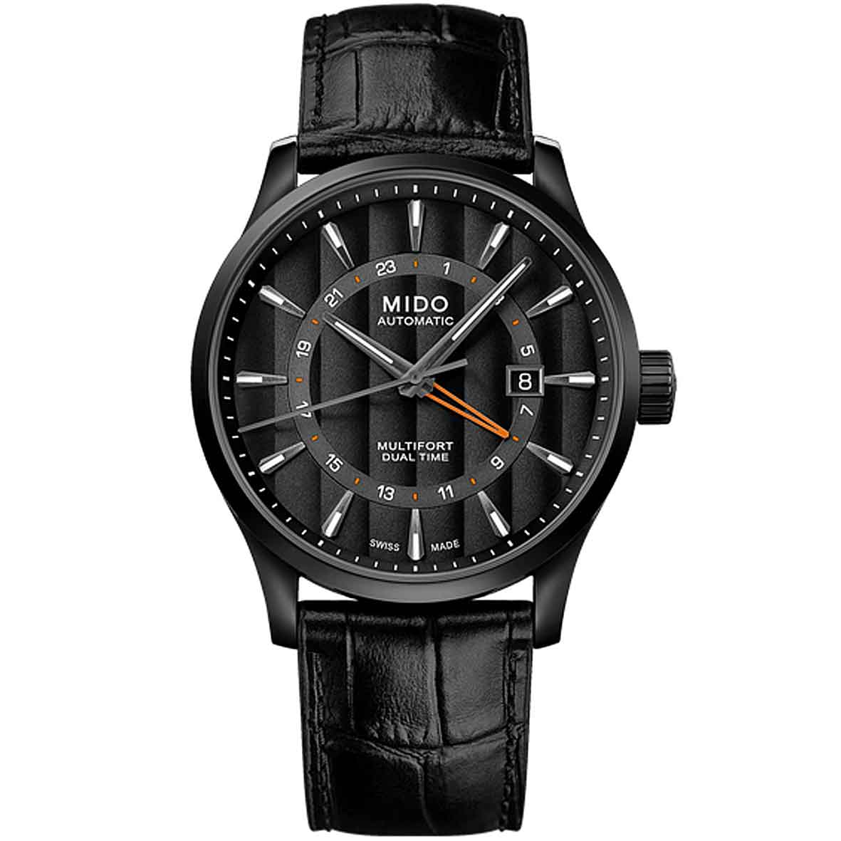 Equipée d'un mouvement exclusif au Swatch Group, la Multifort Dual Time GMT combine un mouvement automatique Calibre 80 et une fonction GMT.