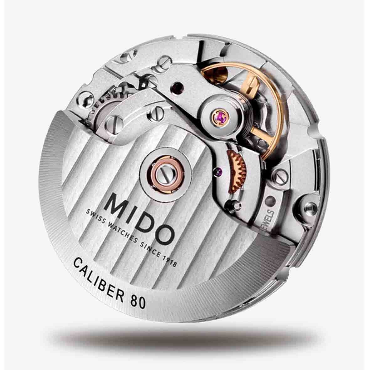 Le mouvement automatique Mido Caliber 80 qui équipe cette montre bénéficie d'une réserve de marche impressionnante allant jusqu'à 80 heures, assurant une grande autonomie et précision.