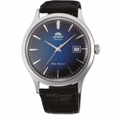Le cadran en dégradé de bleu, à la fois sobre et élégant, est rehaussé du logo Orient et d’un guichet date à 3 heures.
