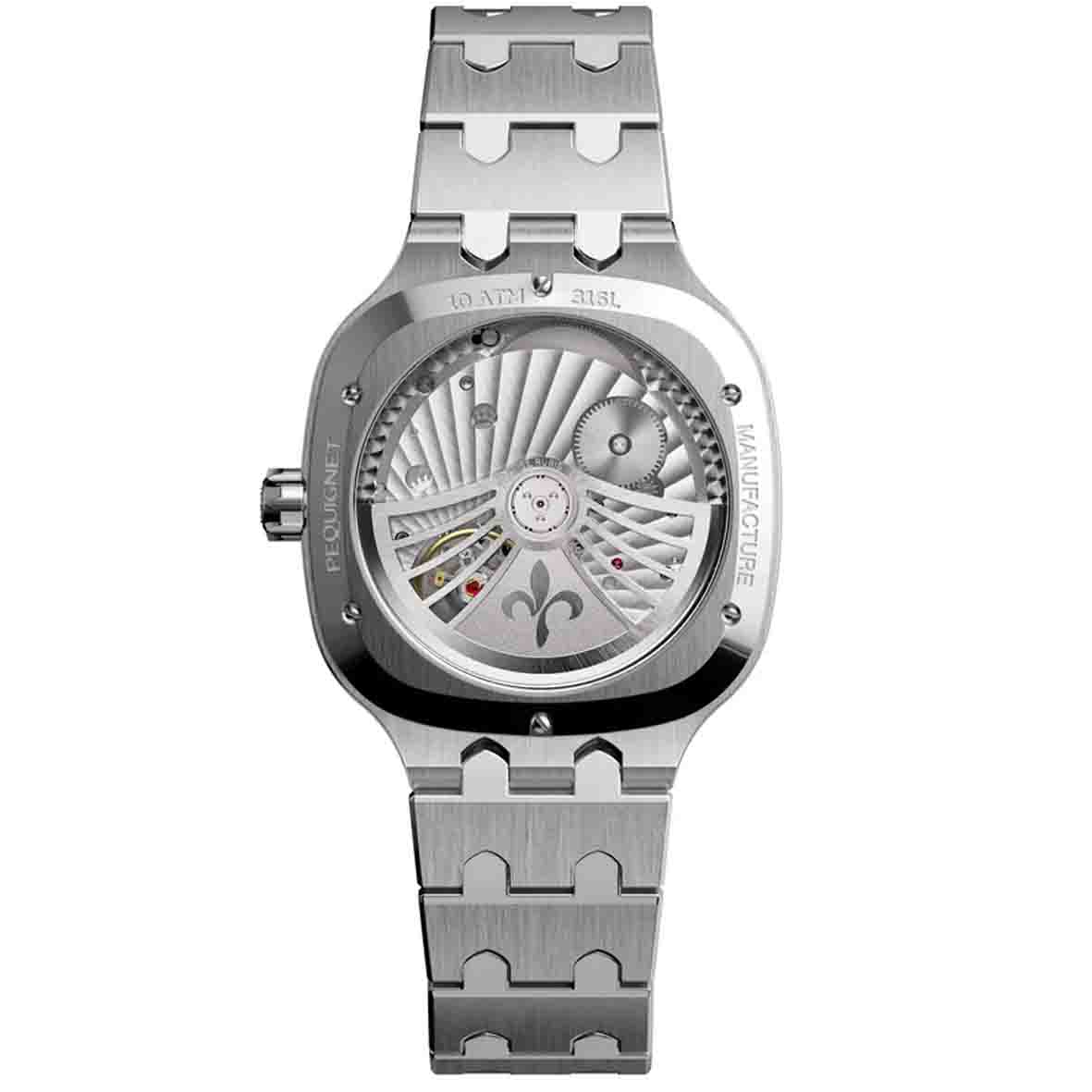 Avec ce modèle sport-chic, la Manufacture française Pequignet réinterprète tous les codes forts de la Maison : l’acier, la maille signature et bien entendu un calibre conçu et assemblé en France.