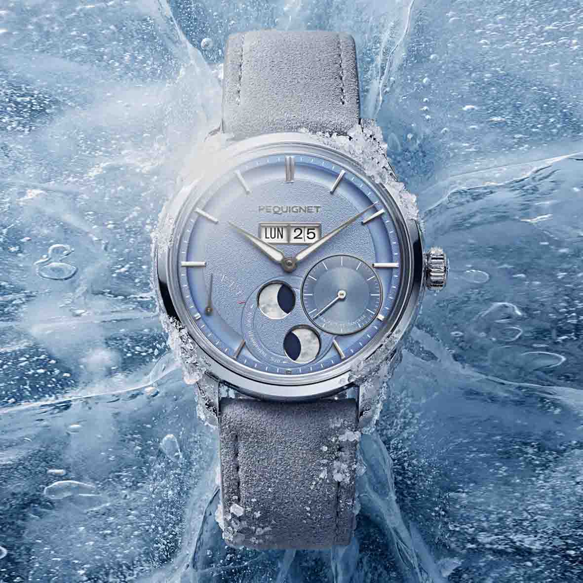 Le cadran bleu glacier valorise chaque détail : sa surface grainée, sa gouge sablée et son compteur de petite seconde rainuré. L'élégance de cette teinte rappelle la pureté des reliefs jurassiens en hiver, créant une harmonie visuelle captivante.