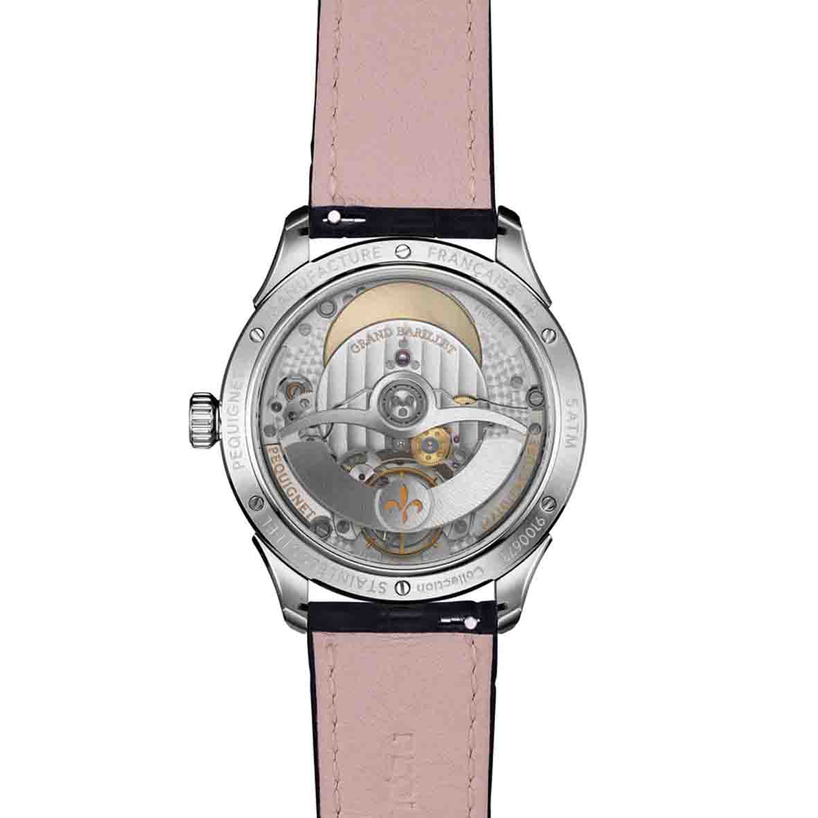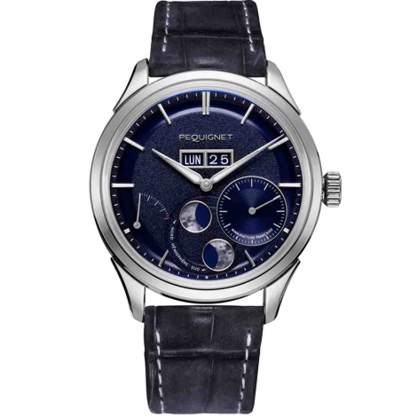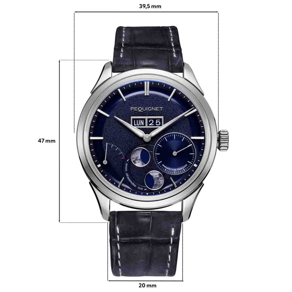 La complication de phases de lune bénéficie d'une représentation inédite chez Pequignet, stylisant la lune selon ses deux hémisphères nord et sud. Les guichets de lune présentent un diamantage subtil pour un rendu plus brillant et réaliste.
