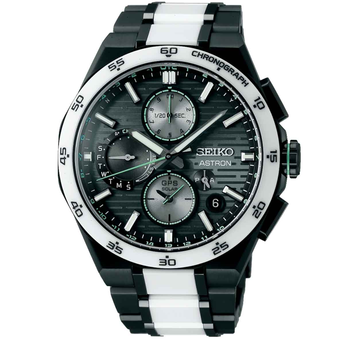 Le boîtier et le bracelet en titane noir au revêtement ultra-résistant sont rehaussés d’éléments en céramique blanche, créant un design percutant et futuriste.