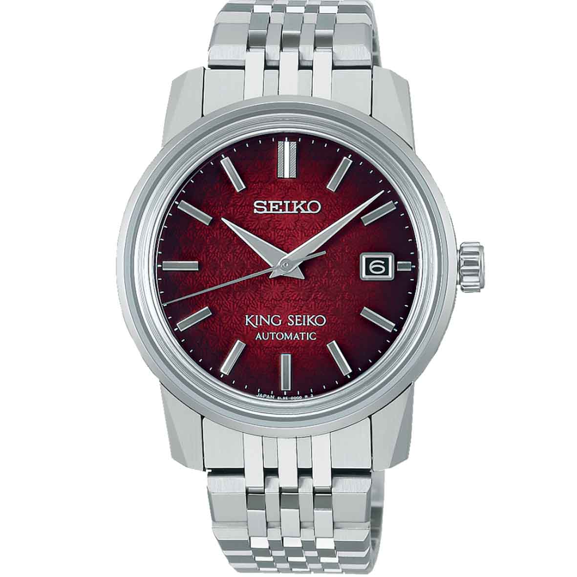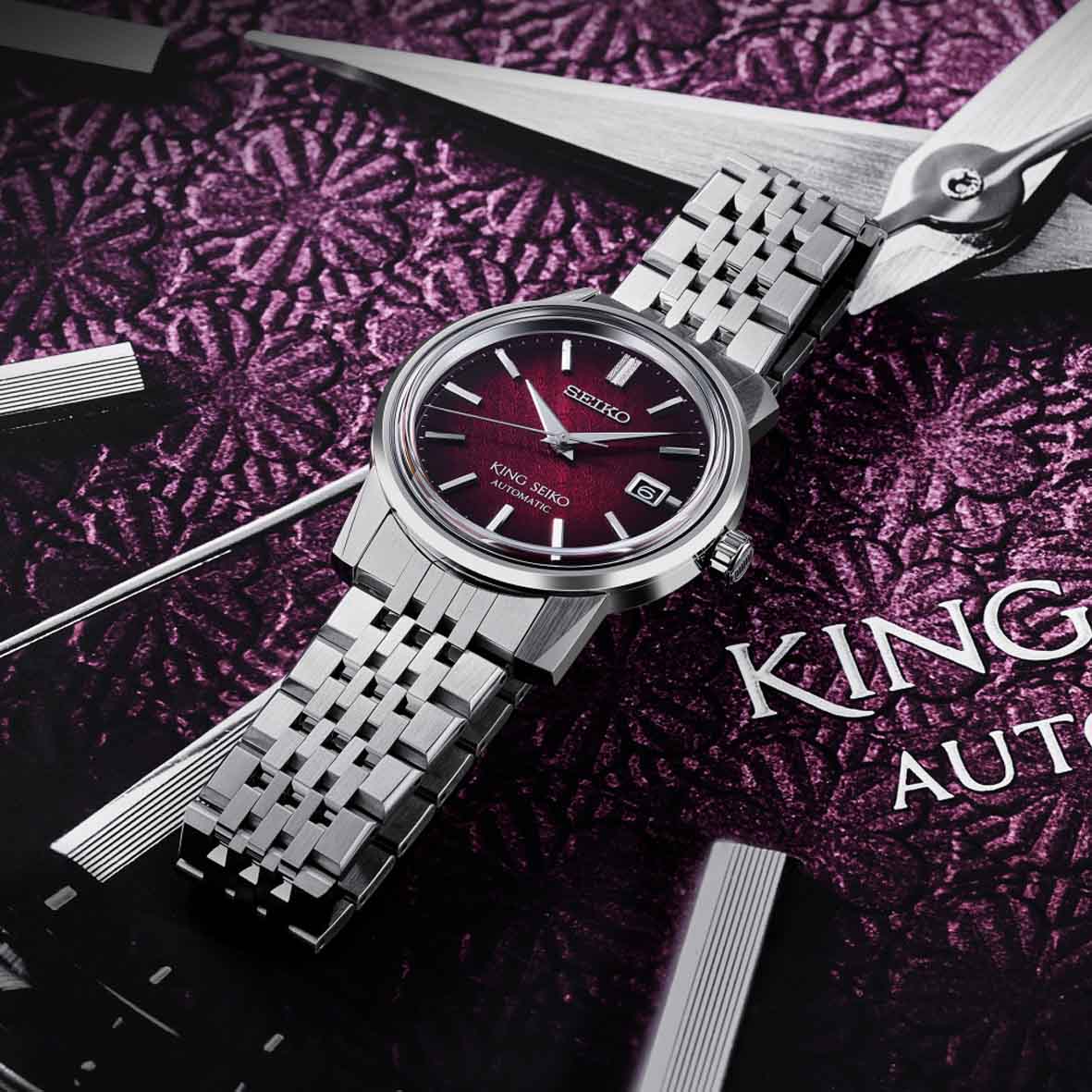 La couleur et le motif du cadran rouge prune « Garyu-bai » de cette montre est inspirée du lieu de naissance du premier King Seiko à Kameido, Tokyo, célèbre pour ses vergers de pruniers.