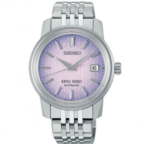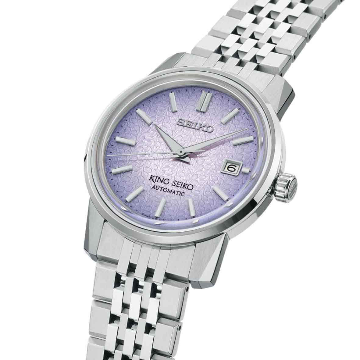 D'une nouvelle teinte violette, « Tenjin-fuji violet », le motif du cadran évoque les glycines qui fleurissent dans le sanctuaire Kameido Tenjin à Kameido, au Japon, lieu de naissance du premier King Seiko.