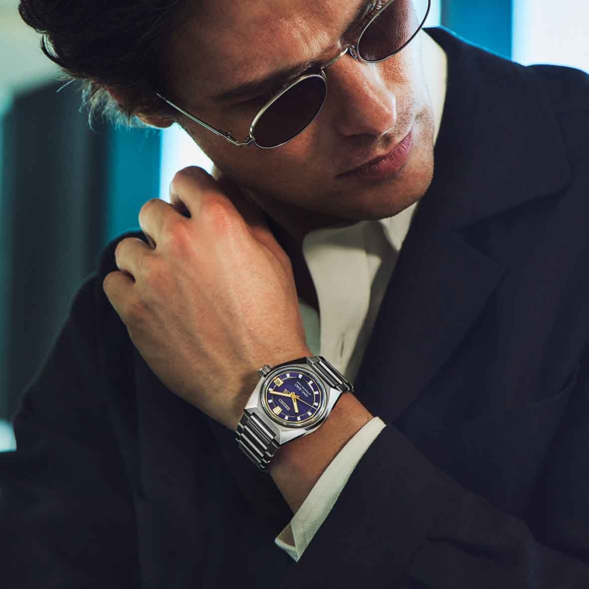Son bracelet en acier inoxydable, équipé d’un fermoir à boucle déployante avec ouverture par bouton-poussoir, assure un maintien confortable et sécurisé.