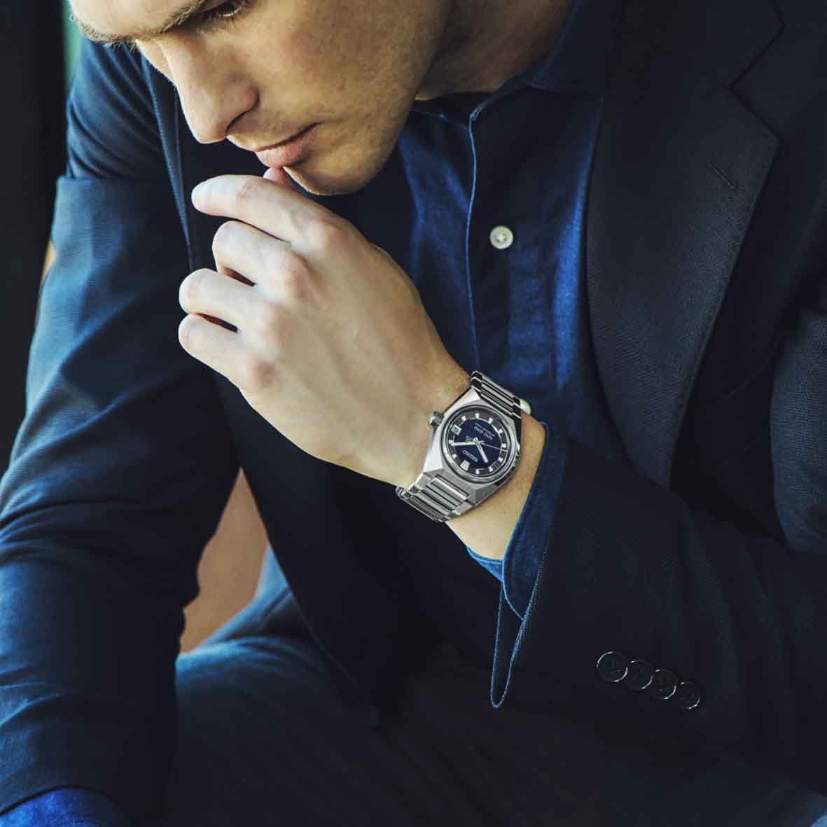 Son mouvement haute fréquence de 28 800 alternances par heure (8 par seconde) assure une précision remarquable, complétée par une fonction d’arrêt de seconde et un affichage de la date.