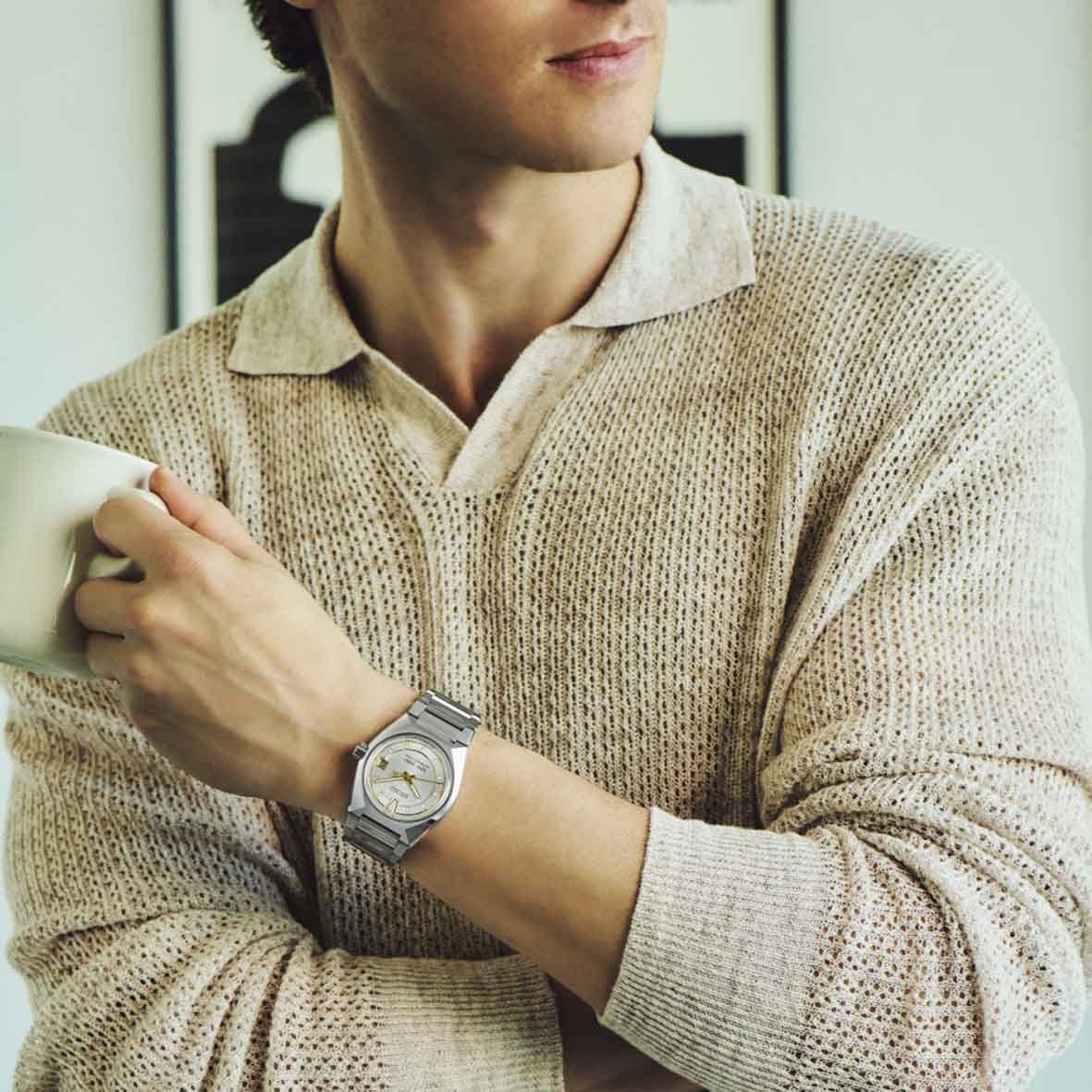 Son bracelet en acier inoxydable, doté d’un fermoir à boucle déployante avec ouverture par bouton-poussoir, garantit un confort optimal et un maintien sécurisé.