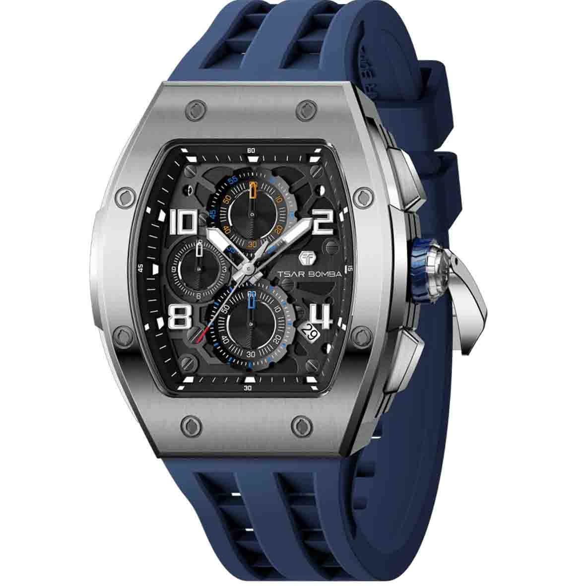 La montre Tsar Bomba Elemental Series incarne l'alliance parfaite entre technologie sportive et élégance urbaine. Avec son boîtier en acier inoxydable 316L et son design aux lignes épurées, cette montre pour homme affirme une présence audacieuse au poignet. Son cadran noir en forme de tonneau accueille un cadran chronographe multifonction à trois compteurs, combinant esthétique sophistiquée et fonctionnalité professionnelle.