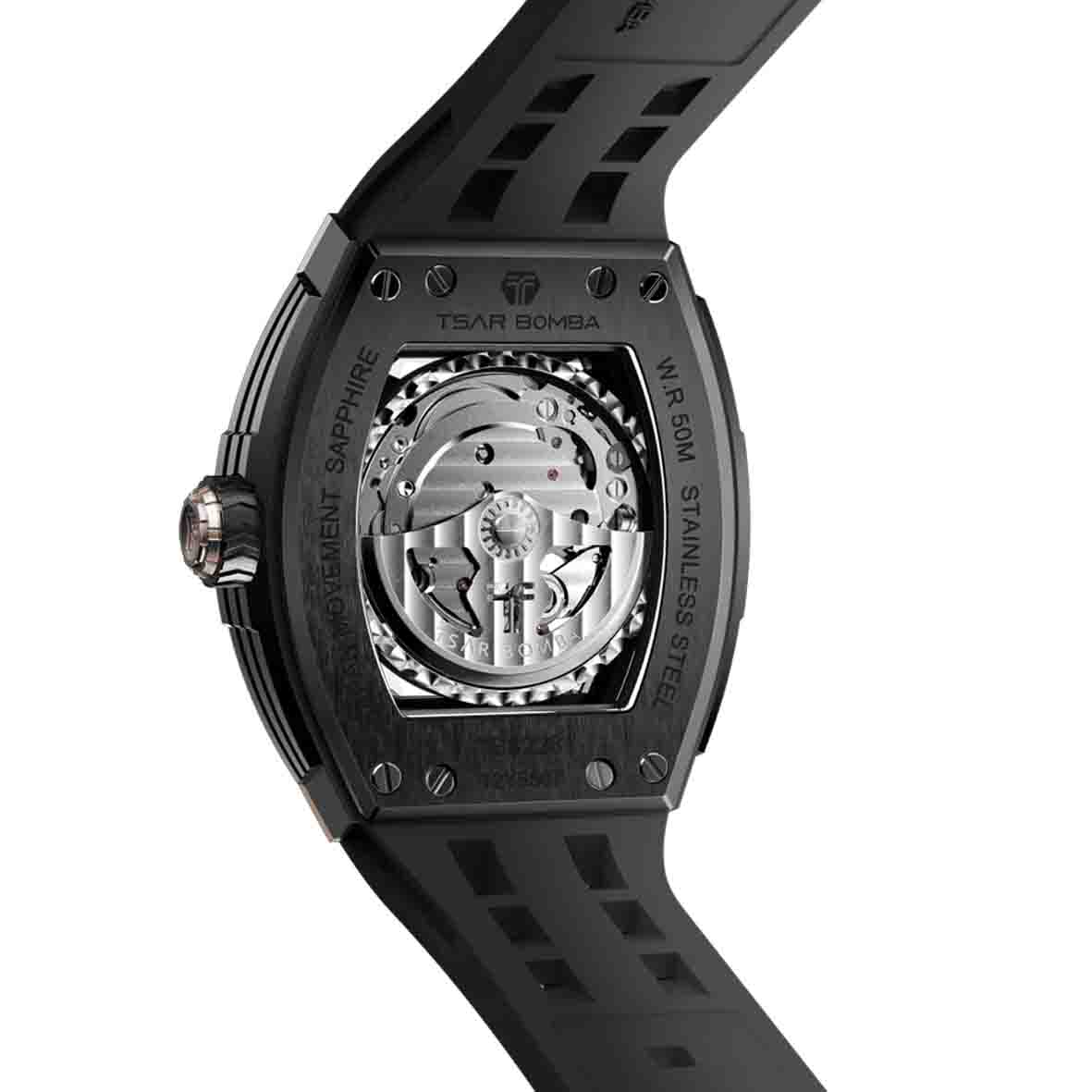 Découvrez la Montre Tsar Bomba Elemental Series, une création horlogère qui fusionne audace futuriste et mécanique de précision. Cette montre automatique pour homme incarne l'essence même du design contemporain avec son boîtier tonneau en acier inoxydable 316L et ses dimensions généreuses (44,8 x 51,5 mm). Le coeur battant de cette pièce réside dans son mécanisme squelette captivant, visible au travers du verre saphir, offrant une fenêtre transparente sur l'âme mécanique de la montre.