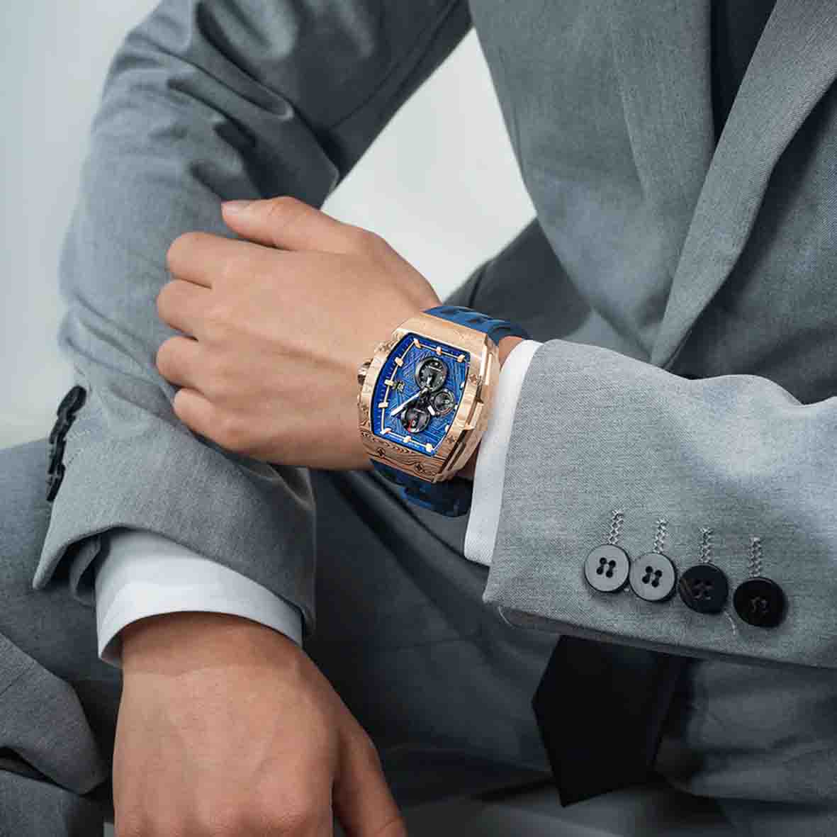 Son boîtier imposant, façonné en acier inoxydable avec un somptueux revêtement PVD or rose, enveloppe un cadran bleu profond à la forme tonneau, évoquant la puissance et le mystère des éléments.
