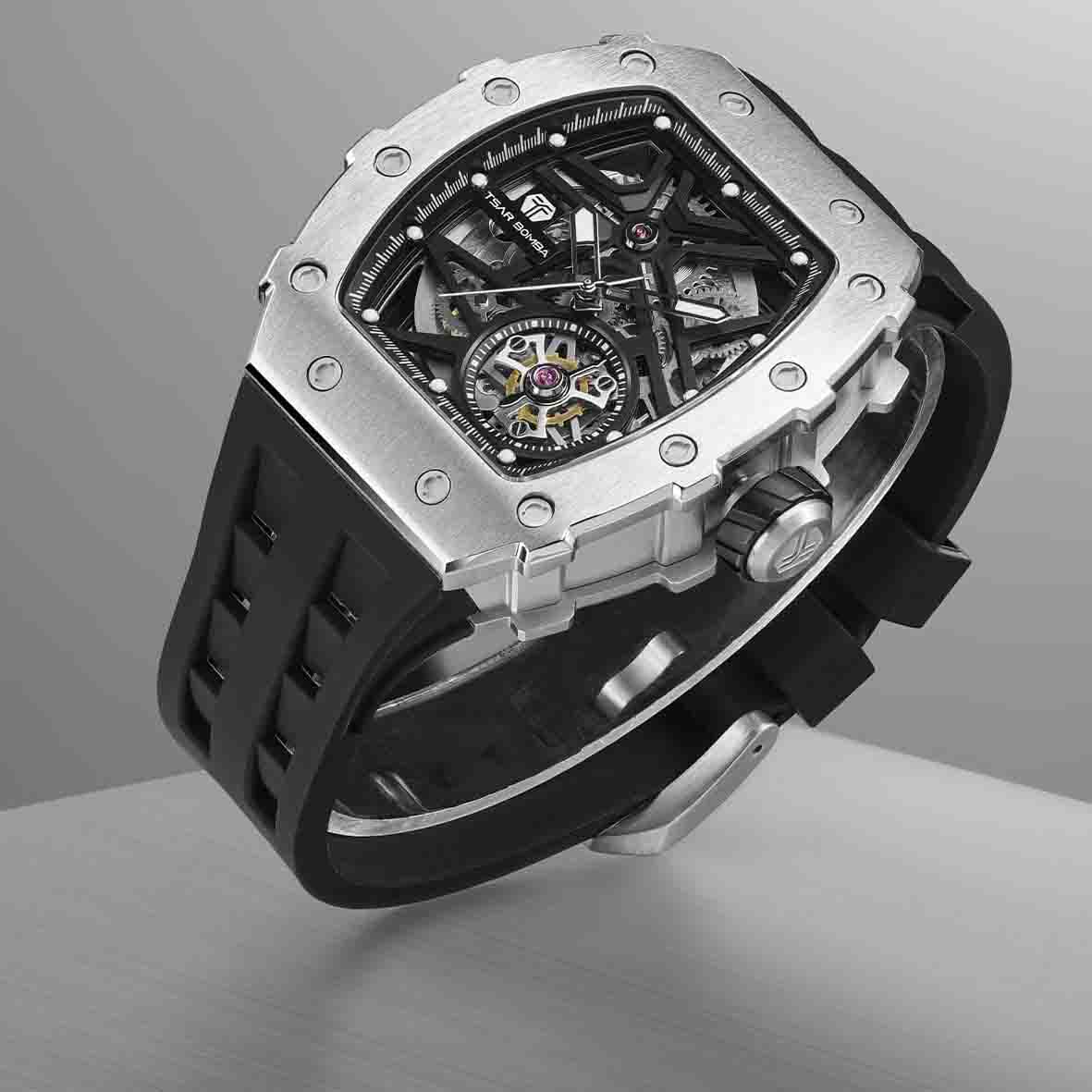 Oui, c'est une montre squelette avec un design audacieux et futuriste de forme tonneau, caractéristique de la collection Elemental Series. Son style met en valeur de façon spectaculaire son mécanisme interne, offrant une esthétique à la fois technique, sportive et résolument moderne.