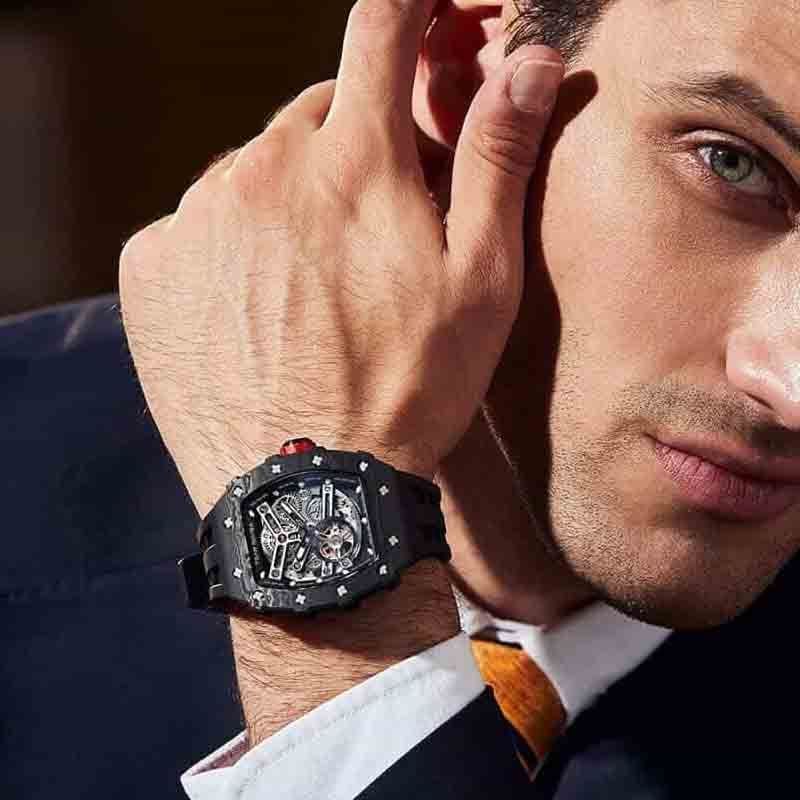 Son cadran tonneau squeletté dévoile toute la complexité de son mouvement automatique.