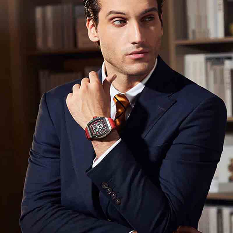 Son cadran noir squelette révèle le raffinement du mouvement automatique, tandis que son bracelet en silicone rouge assure un confort optimal et un maintien sécurisé grâce à une boucle ardillon.