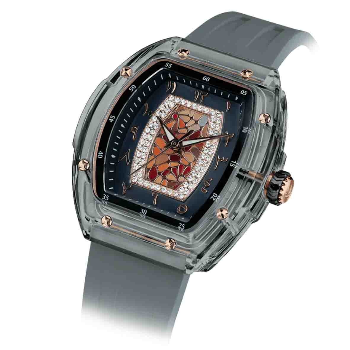 Son design audacieux, marqué par un boîtier tonneau en acrylique transparent, offre une vue fascinante tout en assurant une légèreté remarquable de seulement 45 grammes.