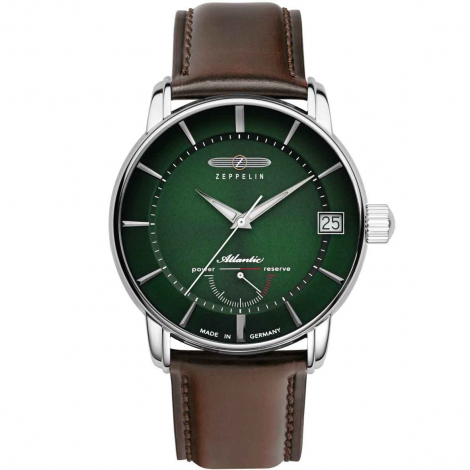 Découvrez la montre Zeppelin, un mélange parfait de raffinement et de modernité, avec son cadran vert foncé élégant orné de chiffres et d'indices argentés et d'aiguilles lumineuses.