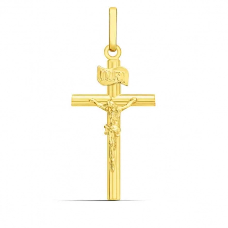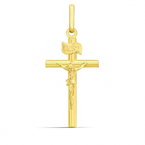 Conçu avec une précision exquise, ce pendentif arbore une hauteur de 29 mm (bélière incluse) et une largeur de 13 mm, des dimensions idéales pour un port quotidien discret ou pour accompagner vos moments les plus précieux. La finesse de ses détails révèle une représentation du Christ empreinte de sérénité et l'inscription "INRI" gravée avec délicatesse au-dessus de la croix, témoignant d'une authenticité et d'une richesse symbolique inégalées. Le choix de l'or jaune 9 carats confère à ce bijou une luminosité chaleureuse et une résistance appréciable, tout en affichant un poids léger de 0.59 grammes pour un confort optimal.