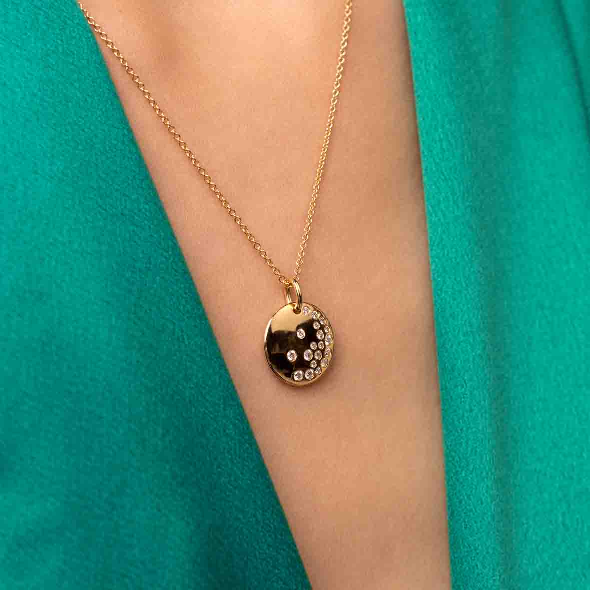 Pendentif Ischia Basics, diamants sur or jaune 750/1000 Pendentif composé de 19 diamants de taille brillants pour un poids total de 0.29 ct Largeur du pendentif : 15 mm. Poids total or 3.2 gr