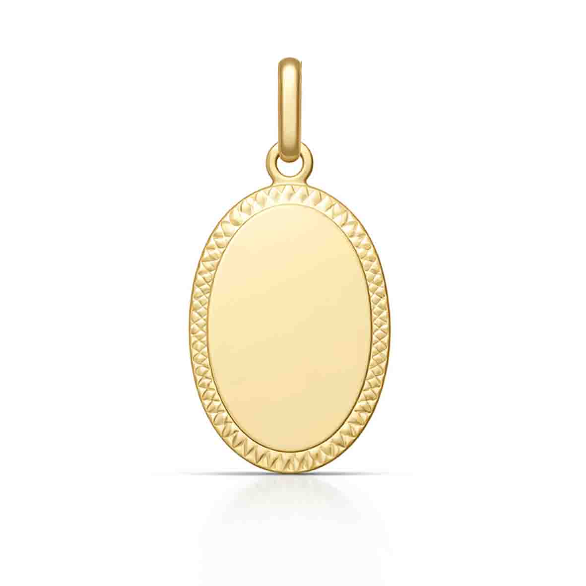 Le motif distinctif de cette médaille ovale réside dans son entourage à motifs, rehaussé d'une finition "Diamond Cut / Polished". Cette technique précise sculpte de fines facettes sur le pourtour du pendentif, capturant la lumière avec une brillance subtile, à la manière d'un éclat précieux. Ses dimensions idéales – 23,6 mm de hauteur (bélière incluse) et 11,6 mm de largeur – lui confèrent une présence gracieuse, ni trop imposante, ni trop effacée.