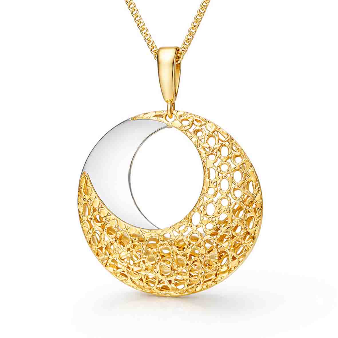 Ce pendentif rond bicolore s'harmonise magnifiquement avec une maille forçat classique, une maille forçat ronde ou une maille gourmette. Nous vous conseillons de choisir une chaîne en or 9 carats pour assurer l'homogénéité et la durabilité de votre ensemble.