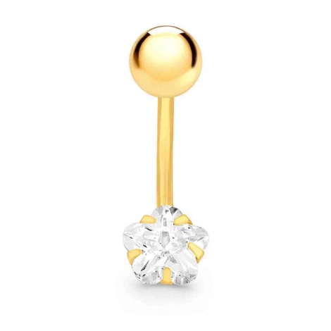 Ce piercing nombril est entièrement confectionné en or jaune 9 carats (375/1000), un alliage d'or de qualité supérieure particulièrement apprécié pour les bijoux de piercing. L'oxyde de zirconium, pierre fine utilisée pour les ornements, offre une brillance remarquable et durable.