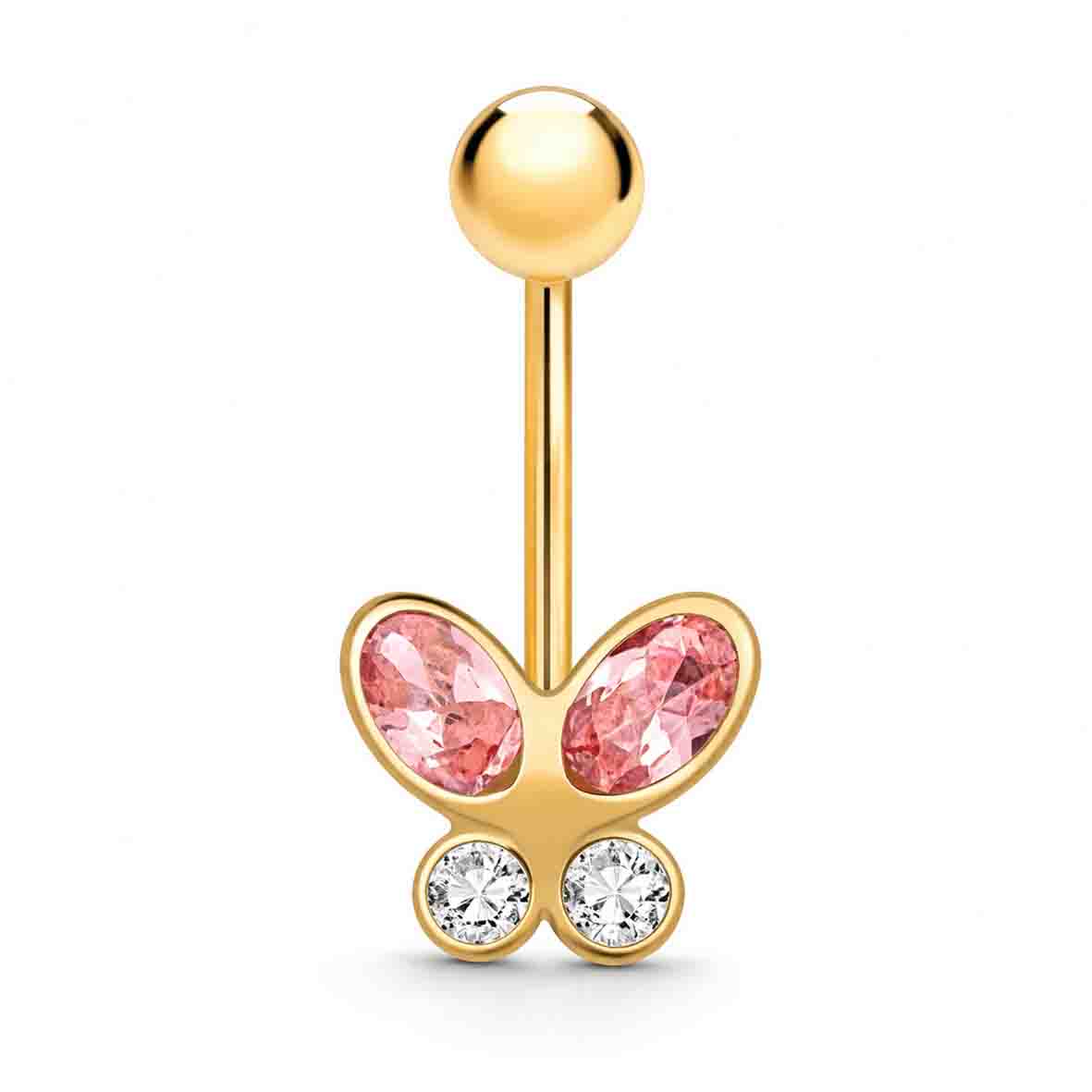 Découvrez notre élégant piercing nombril papillon, une création délicate alliant l'intemporel charme de l'or 9 carats à l'éclat captivant de l'oxyde de zirconium. Ce bijou de ventre féminin se distingue par son design papillon sophistiqué, orné de pierres scintillantes rose et blanc qui dansent légèrement au fil de vos mouvements.