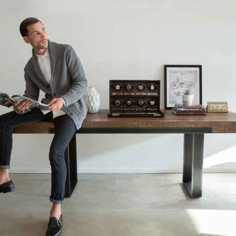 Roadster - inspiré par le meilleur des automobiles britanniques, Jaguar, Aston Martin, Bristol et autres. Tournant parfaitement votre montre à un nombre précis de tours, le bois d'ébène macassar poli et la quincaillerie chromée du remontoir Roadster 8 pièces constituent la toile de fond parfaite pour votre montre.