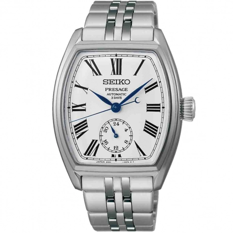 Au cœur de son design, le cadran en émail blanc, façonné avec une précision remarquable, accueille des chiffres romains qui s’harmonisent élégamment avec la silhouette du boîtier. Ce savoir-faire artisanal confère à la montre une profondeur visuelle et une lisibilité exceptionnelle, témoignage de l’engagement de Seiko envers l’excellence. Pour la toute première fois dans cette collection, un bracelet en acier inoxydable accompagne ce boîtier tonneau, offrant un confort et une souplesse remarquables pour une expérience de port inégalée.