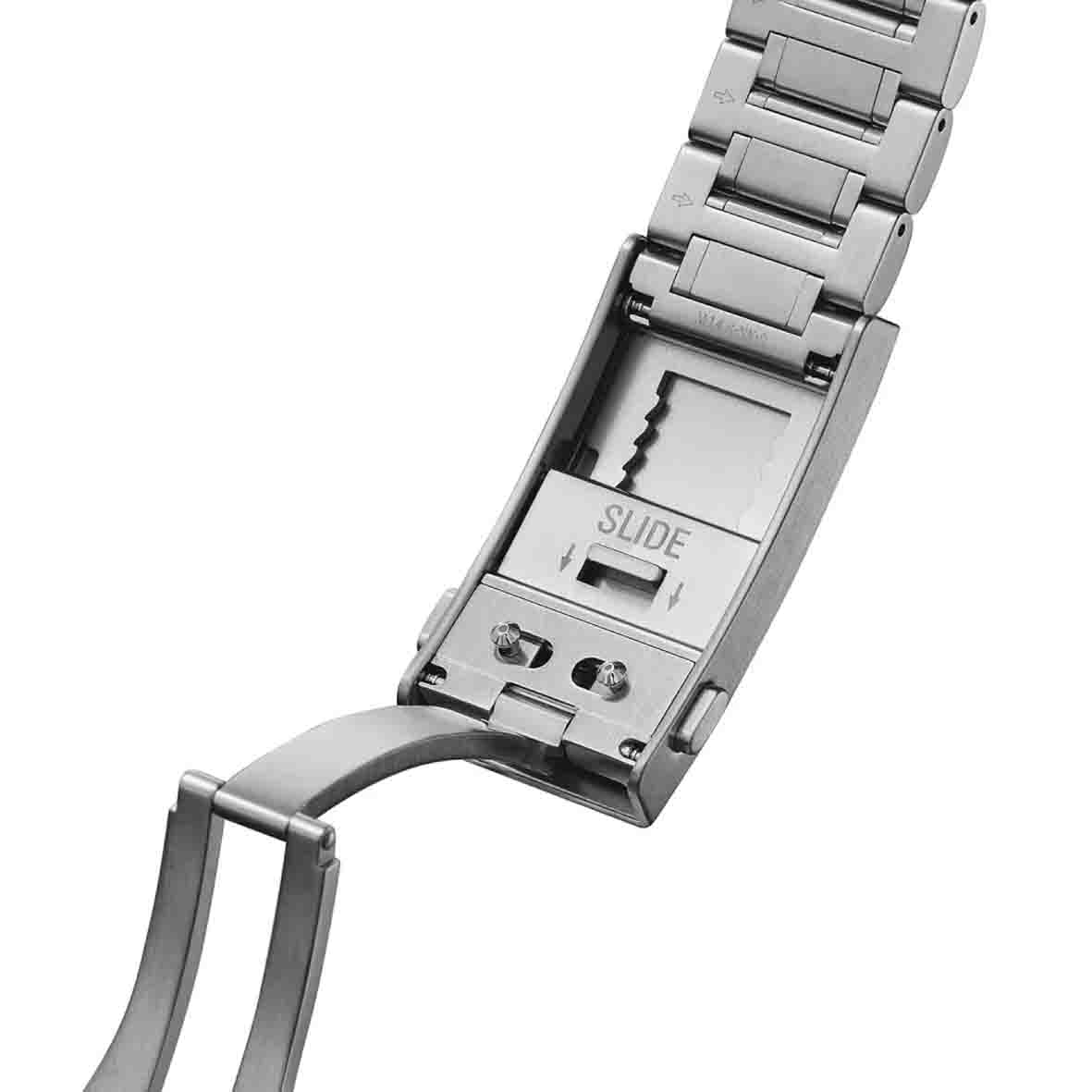 Le bracelet en acier inoxydable est équipé d'une boucle déployante avec système de micro-ajustement. Vous pouvez ajuster précisément la taille pour un confort optimal, même par-dessus une combinaison de plongée.